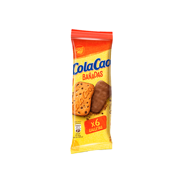 Las ColaCao Bañadas 63g son unas irresistibles galletas con pepitas de chocolate, cubiertas con una capa de auténtico chocolate que incorpora el inconfundible sabor de ColaCao. Estas galletas son la merienda perfecta para todas las edades, ofreciendo una experiencia única que combina el crujiente de la galleta con el sabor clásico de ColaCao en cada bocado.