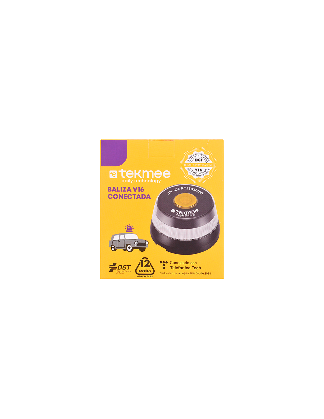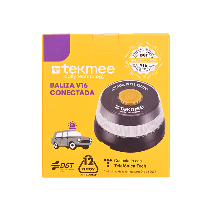Venta de Baliza v16 Conectada Tekmee, luz de emergencia v16 conectada a DGT 3.0, con tecnología Telefónica Tech. Baliza reglamentaria y homologada por la DGT.